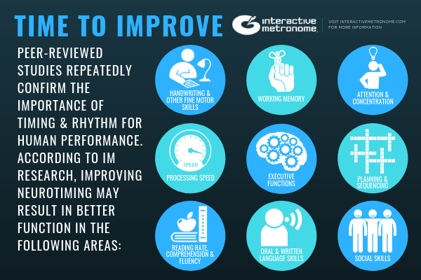 Neural timing is the basis for attention, working memory and processing speed, all of which are critical for social interaction, attention, handwriting, behavior and language development. Interactive Metronome (IM) is the therapeutic tool we use and recommend to improve neural timing for children with a variety of challenges (autism, ADHD, dyslexia, sensory processing, coordination, etc). IM is the only training program that improves timing in the brain in an organized, systematic, flexible and engaging format. Research shows that combining whole body movements with cognitive tasks leads to overall better outcomes. IM is a patented and unique training tool that challenges thinking and movement simultaneously, providing real-time millisecond feedback to help synchronize the body’s “internal clock.”
