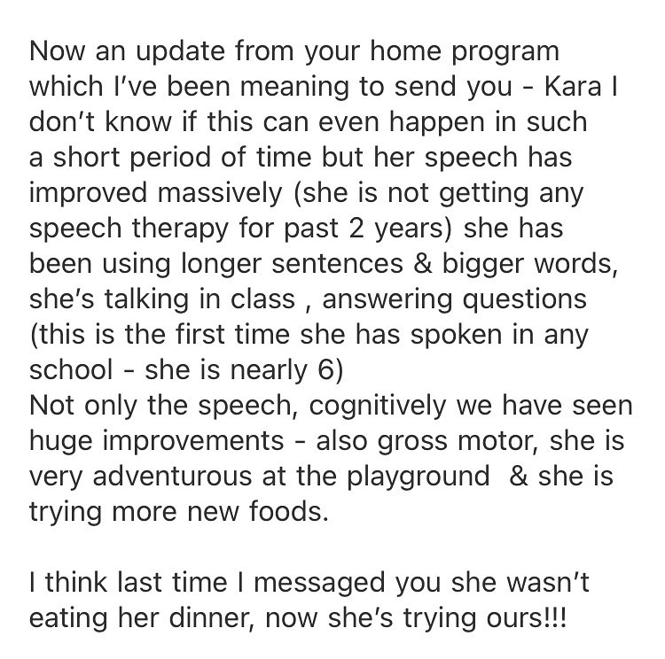 "Brain balancing has been the best therapy for my son. We stalled out on speech therapy for the past two years. No progress was being made. His articulation was great but his cadence and rate of speech was broken, especially if he was doing a lot of talking or excited. Reading was a big chore because his fluency was also fragmented. At eight, he had above-grade vocabulary but reading the words in a chapter was painful due to the cadence of his reading. Fifteen minutes of reading was a huge effort and required a lot of coaching along the way.